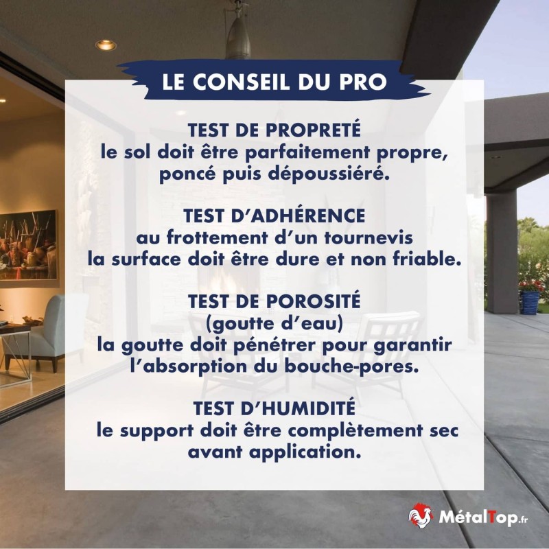 Appliquez sur support brut, sec, propre et sain, exempt de poussière ou d’humidité résiduelle. Bien agiter avant emploi. Étaler uniformément, puis laisser sécher avant la finition. Adapté à tous types de bétons et mortiers poreux, en intérieur comme en extérieur.