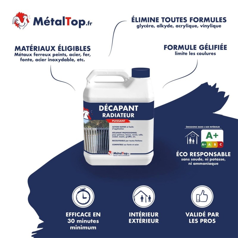 Bonjour, notre produit est un décapant professionnel spécialement conçu pour les radiateurs. Vous pourrez facilement retirer les anciennes couches de peinture ou de vernis, sans endommager la surface métallique du radiateur.