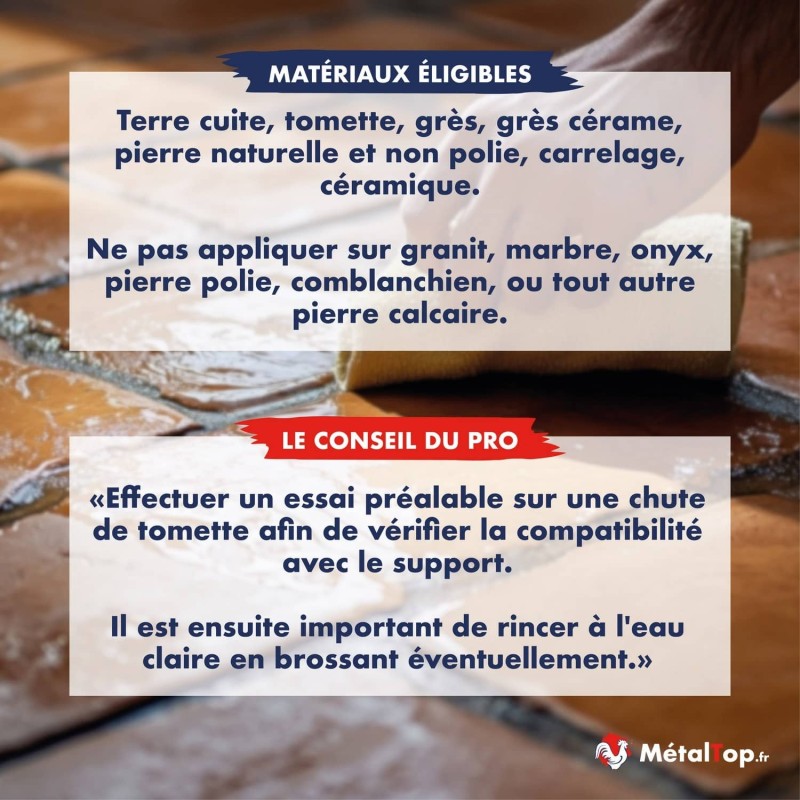 Je l'utilise depuis 10 ans sur terre cuite. Jamais déçu. C'est du costaud pour les sols anciens encrassés.