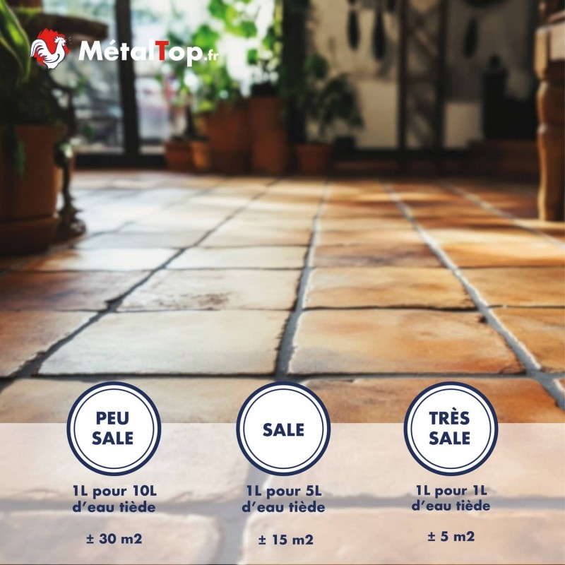 Bon produit pour le nettoyage de fin de chantier sur terre cuite. Il enlève bien le voile terne et les résidus gras, même s'il faut parfois deux passes sur les zones chargées.