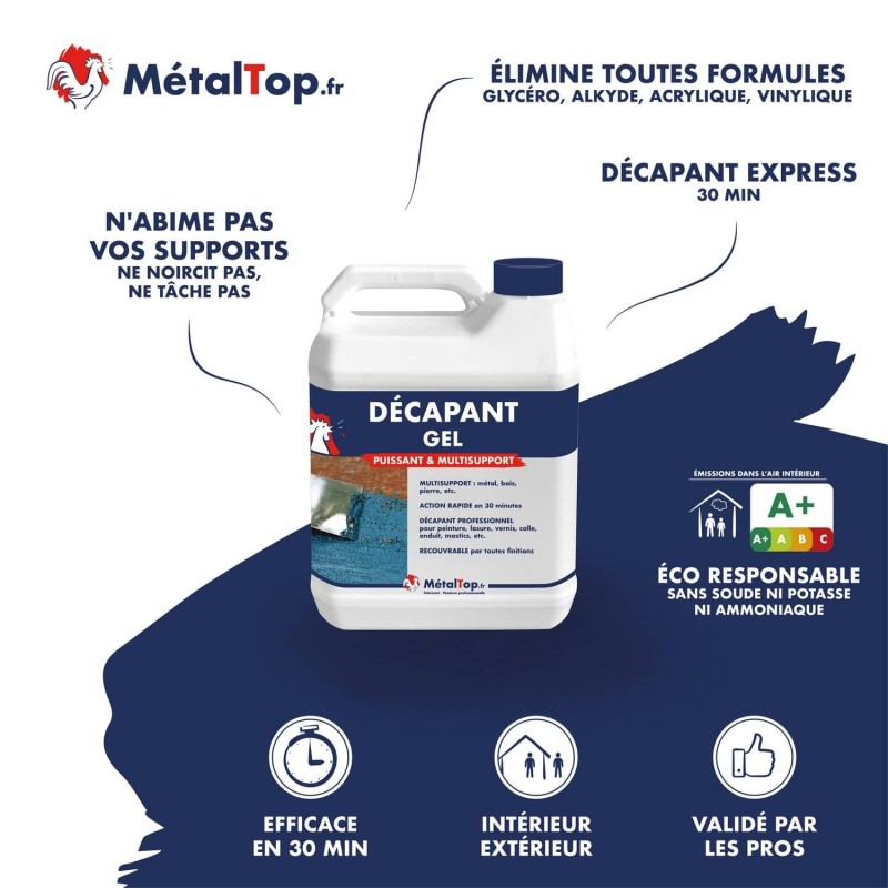 Le décapant en gel élimine facilement les différentes couches de peintures mono composant. Il permet d'agir très rapidement sur toute l'épaisseur de la peinture grâce à une formule particulièrement mouillante. Il élimine sans aucune difficulté un mastic, une colle, une lasure, un vernis ou une peinture. Il possède une structure gélifiée qui lui permet de ne pas couler sur un support verticale.