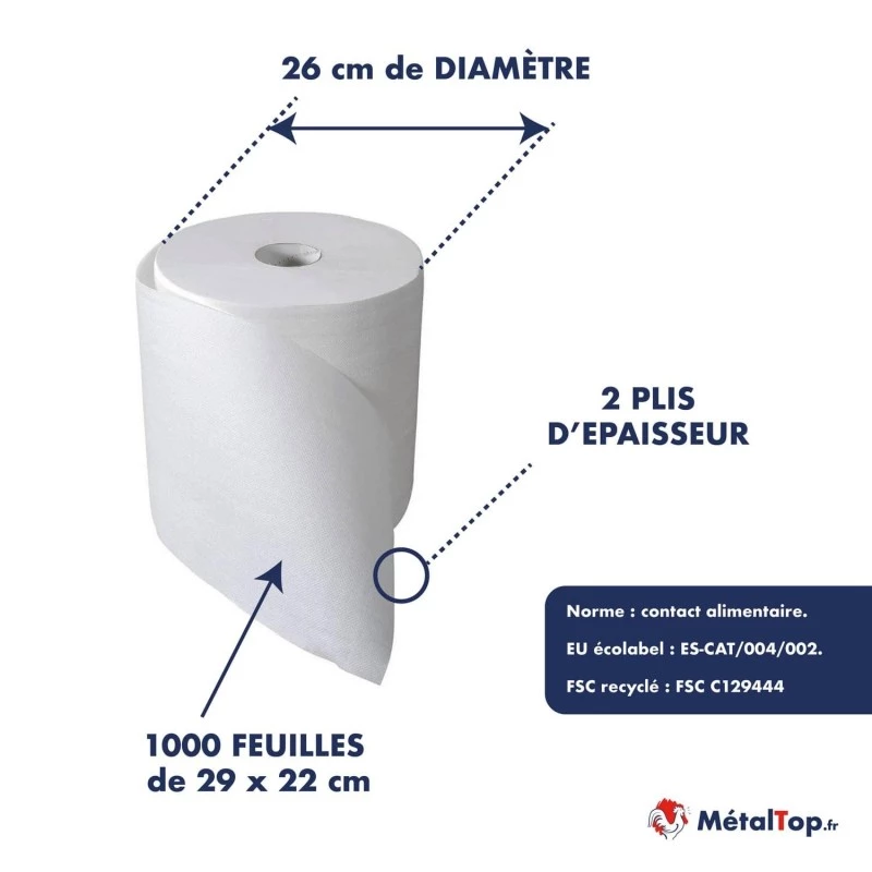 2 bobines d'ouate naturelle de 1000 feuilles (29X22cm) très absorbante à forte épaisseur.