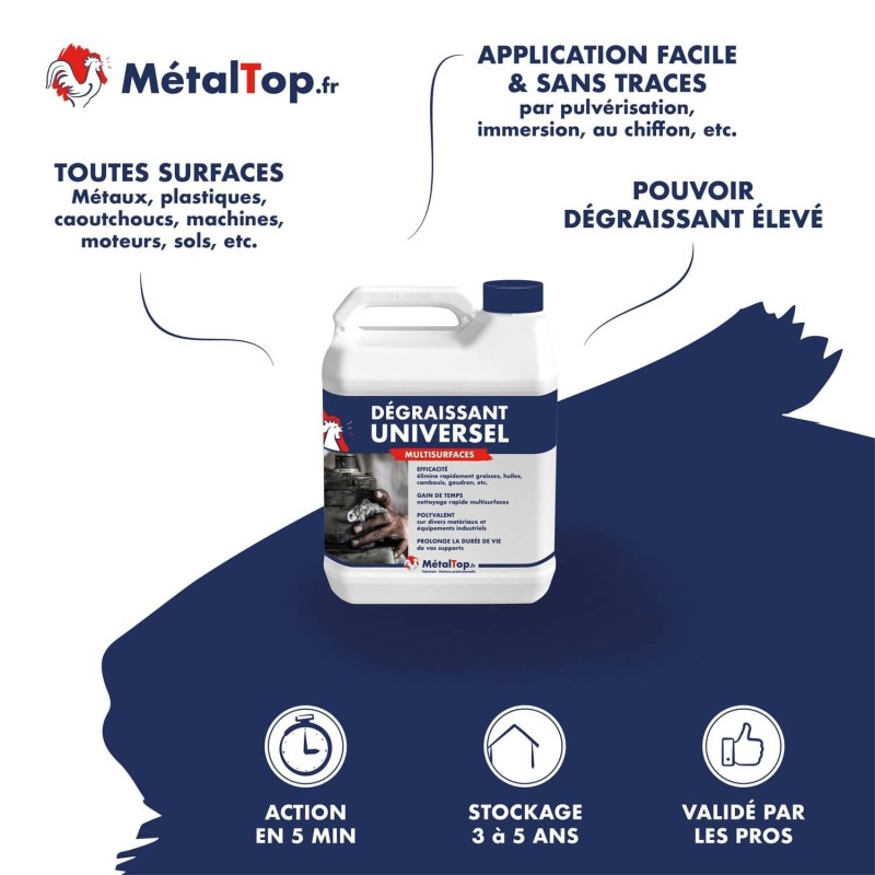 Dégraissant universel concentré : s'utilise pur ou dilué pour dissoudre les graisses, huiles et l'encrassement tenace.