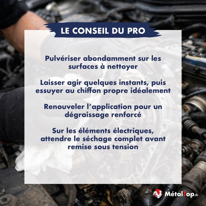 Attention : ce produit est destiné exclusivement au nettoyage et au dégraissage. Ne pas appliquer sur surfaces chaudes, plastiques sensibles ou sous tension électrique.