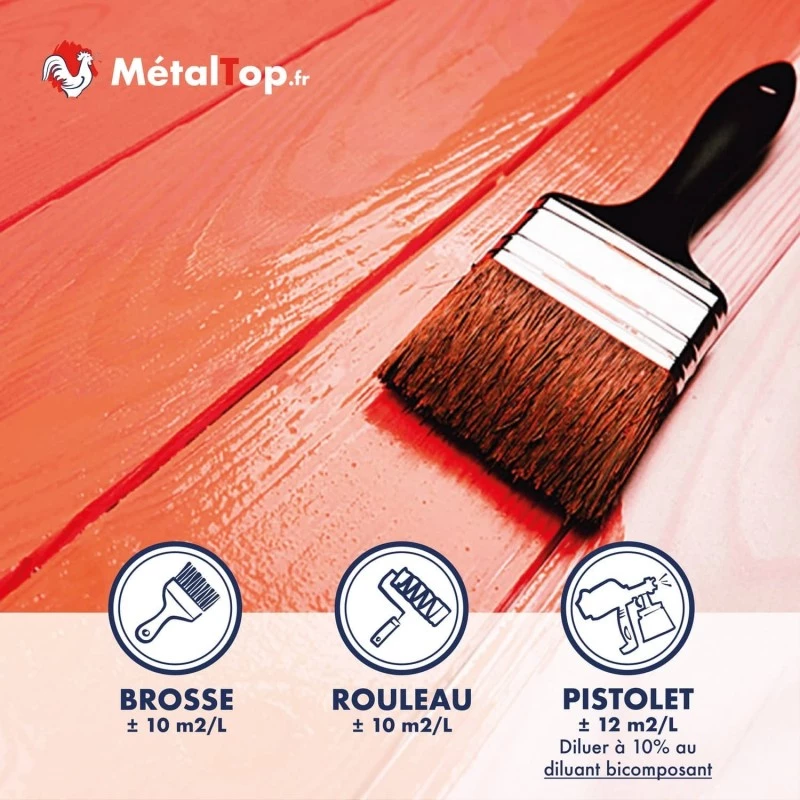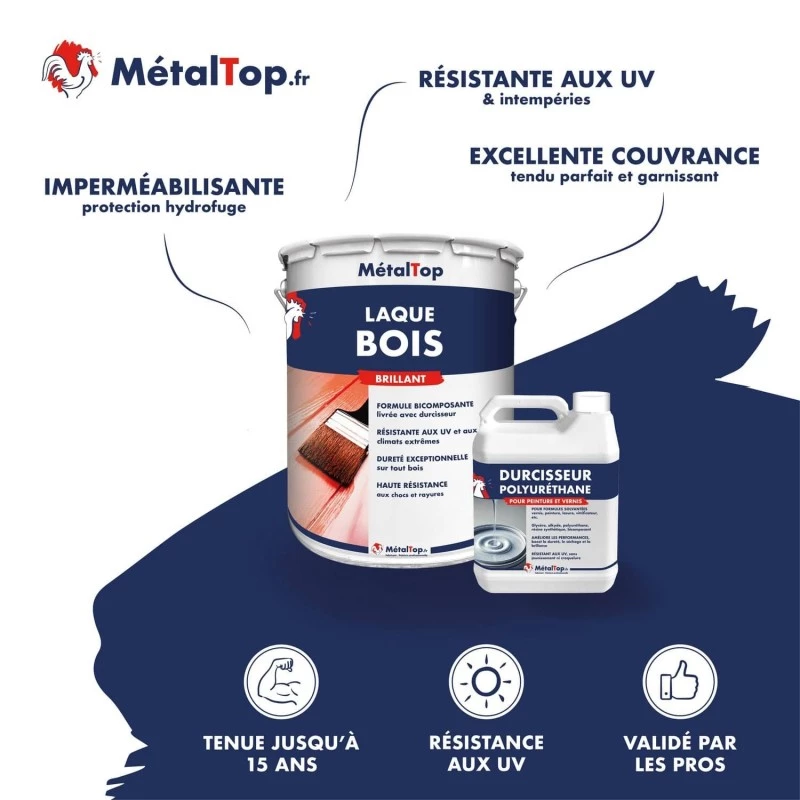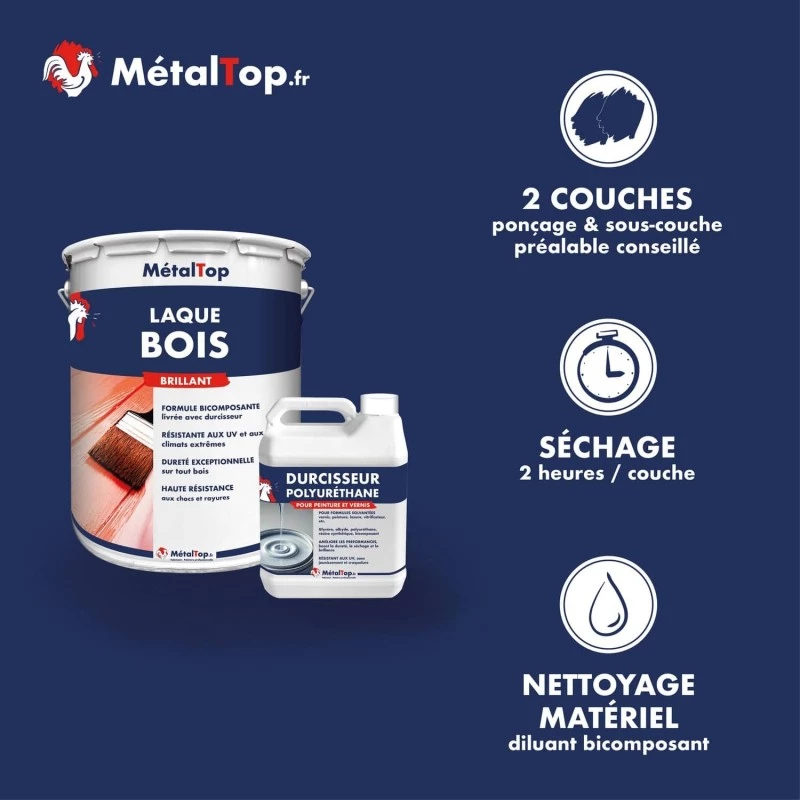 La laque pour bois à 2 composants (durcisseur inclus) vous permet de décorer tous vos bois, intérieurs et extérieurs en leurs offrant une magnifique brillance. Elle s'applique par conséquent, parfaitement sur vos volets, portes, huisseries ou toutes autres menuiseries. Le durcisseur offert avec cette laque permet au bois, grâce à une excellente polymérisation à coeur, de résister, aux chocs, aux rayures et à l'abrasion. De plus, le film garde une grande souplesse ce qui l'empêche de fissurer lors de la dilatation des bois exposés aux fortes chaleurs.