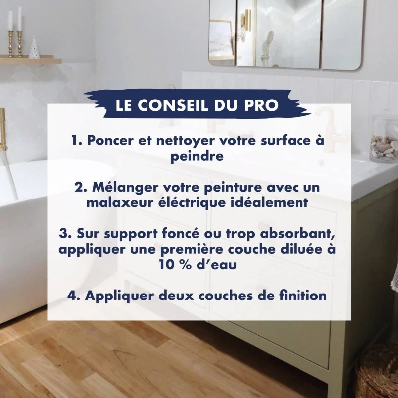 C'est une peinture que je conseille souvent pour les petits budgets qui veulent rafraîchir leur salle de bain. Fiable et avec un très beau fini.