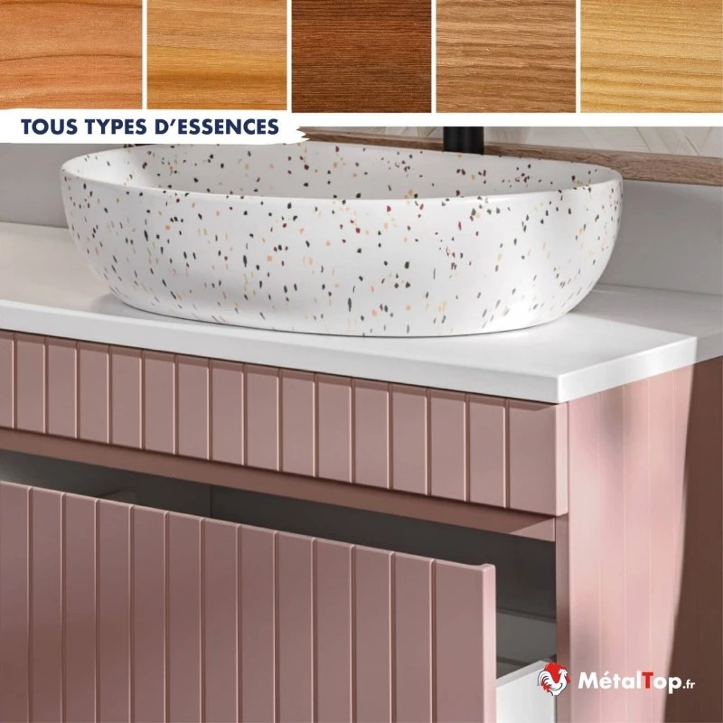 Disponible dans une large gamme de couleurs tendance, elle permet d'harmoniser votre salle de bain selon vos goûts. Elle crée une surface résistante, facile à entretenir et agréable au toucher, pour des meubles durables et esthétiques.
