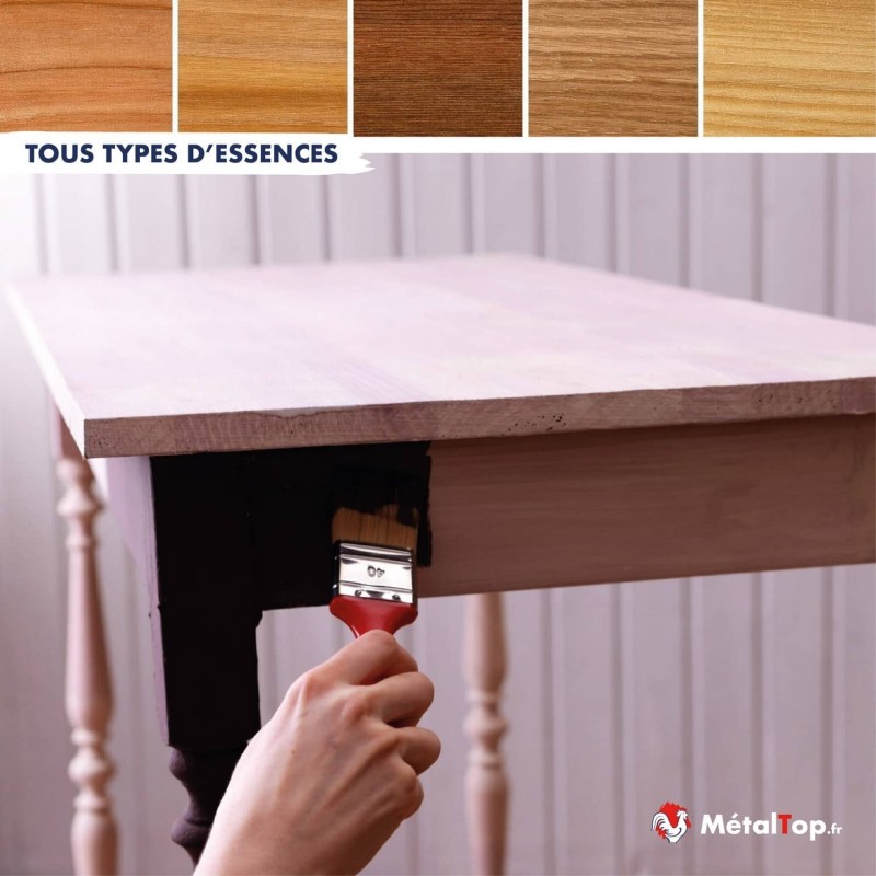 Effectuez un test sur une zone discrète pour vérifier l’adhérence et le rendu final. Sur bois exotiques ou huilés (type teck), veillez à bien poncer et dégraisser la surface avant application. Nettoyez les outils à l’eau claire après usage. Aérez bien la pièce pendant et après l’application.