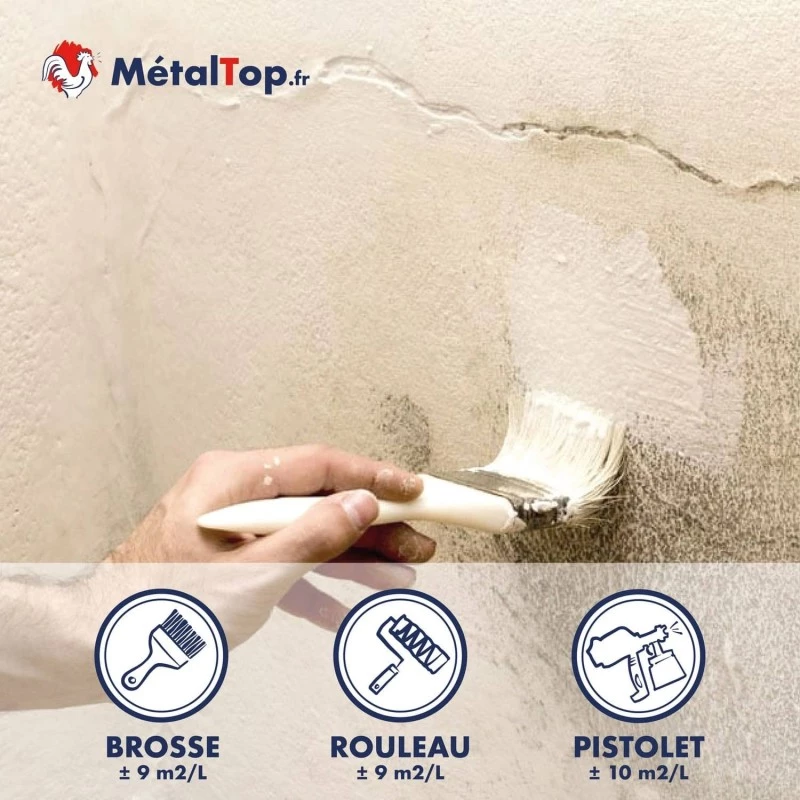 Appliquez en couche fine et régulière, au rouleau ou au pinceau. Sur zones fortement tachées, une deuxième couche localisée peut être nécessaire pour une isolation complète.QUESTION
