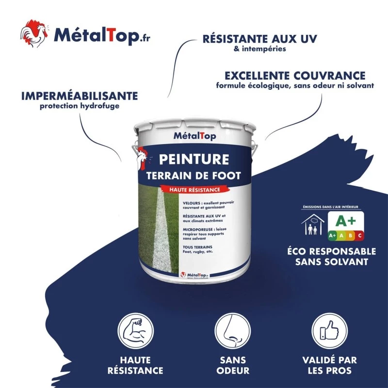 La peinture pour terrain de foot est destinée au traçage de ligne de tous les terrains de sports, rugby ou football engazonnés subissant le passage intensifs de joueurs et de ballons. Elle apporte une excellente blancheur grâce à une très forte teneur en oxyde de titane. Elle assure un remarquable rendu lumineux en utilisation nocturne grâce à l'utilisation de charges minérales adaptées.