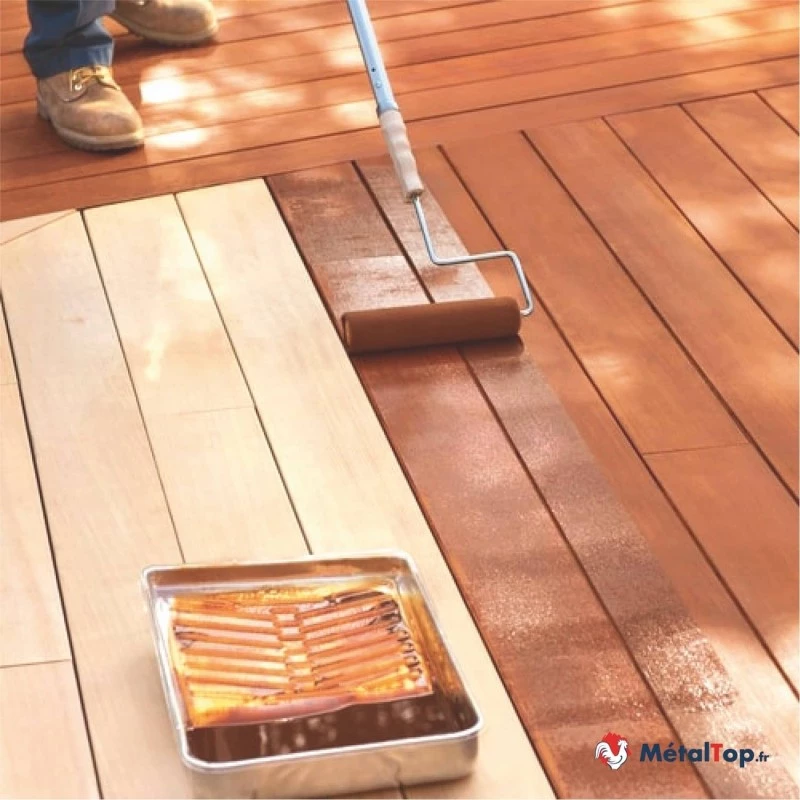 Nous vous conseillons tout d'abord d'appliquer notre primaire sol puis 2 couches de PEINTURE SOL BOIS dans laquelle il faut ajouter notre poudre antidérapante.