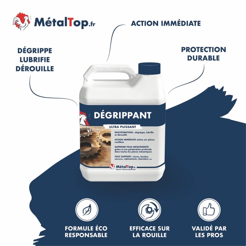 Notre dégrippant en spray et en bidon est facile à utiliser et s'applique en quelques secondes, ce qui en fait un choix idéal pour les professionnels de la mécanique et les bricoleurs. Que ce soit pour des pièces de moteur, des charnières de porte, des outils de jardinage, des équipements de plomberie, un robinet, une serrure, un boulon et bien d'autres pièces en métal, ce dégrippant ultra puissant est parfaitement adapté à toutes vos applications. Sa capacité à agir rapidement sur les surfaces métalliques en fait un allié indispensable dans votre atelier, vous permettant de travailler efficacement et sans interruption.