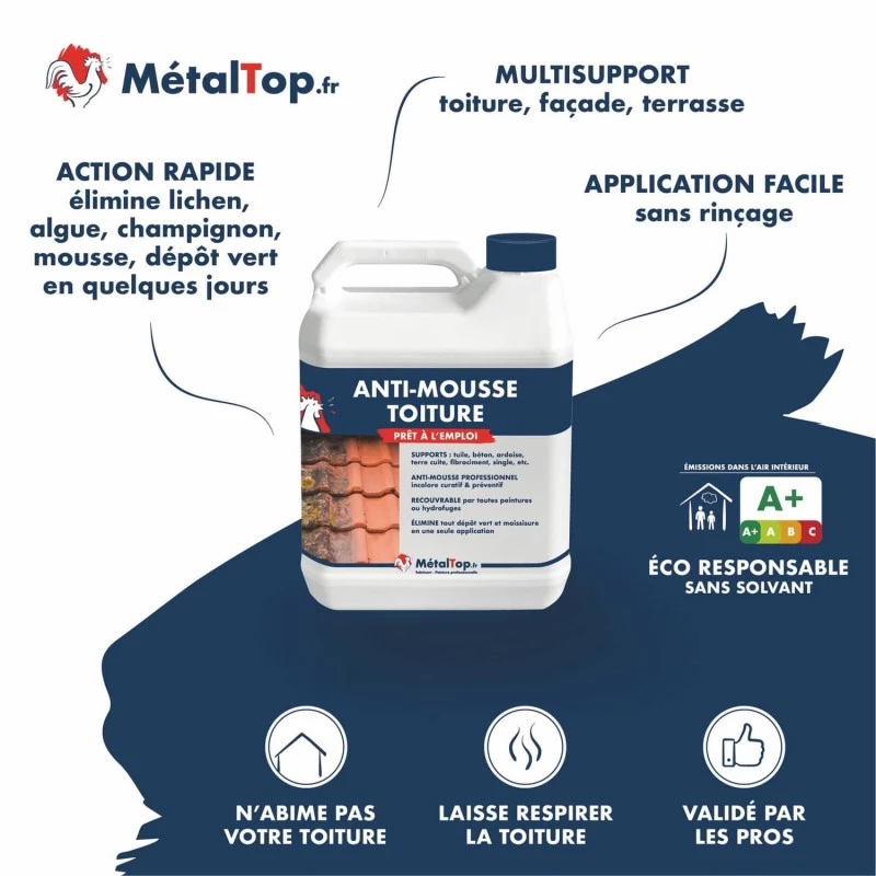 En tant que pro, nous connaissons tous l'antimousse Sika. Je tenté l'antimousse Métaltop qui fait exactement le même job mais en moins cher. Je recommande donc. dommage qu'il ne soit pas en magasin physique. Obligé de commander en ligne. Seul bémol. La livraison s'est quand même bien passé, en 24 H, à domicile. Mon carton était tout abimé mais mon bidon à l'intérieur RAS.