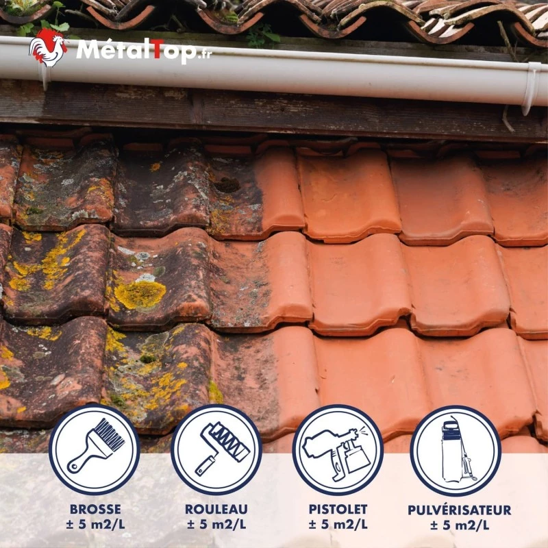 Appliquez le produit sur une toiture propre et sèche, du bas vers le haut, à l’aide d’un pulvérisateur, d’un rouleau ou d’une brosse. Laissez agir sans rincer : la pluie se chargera d’éliminer naturellement les résidus au fil des semaines.QUESTION