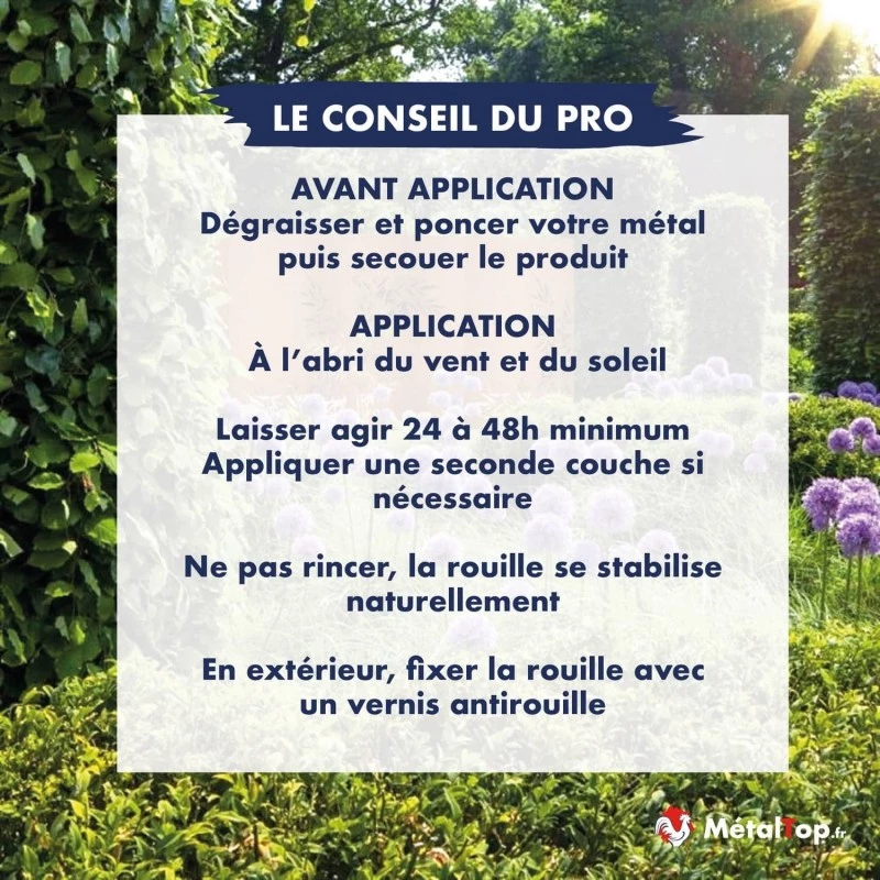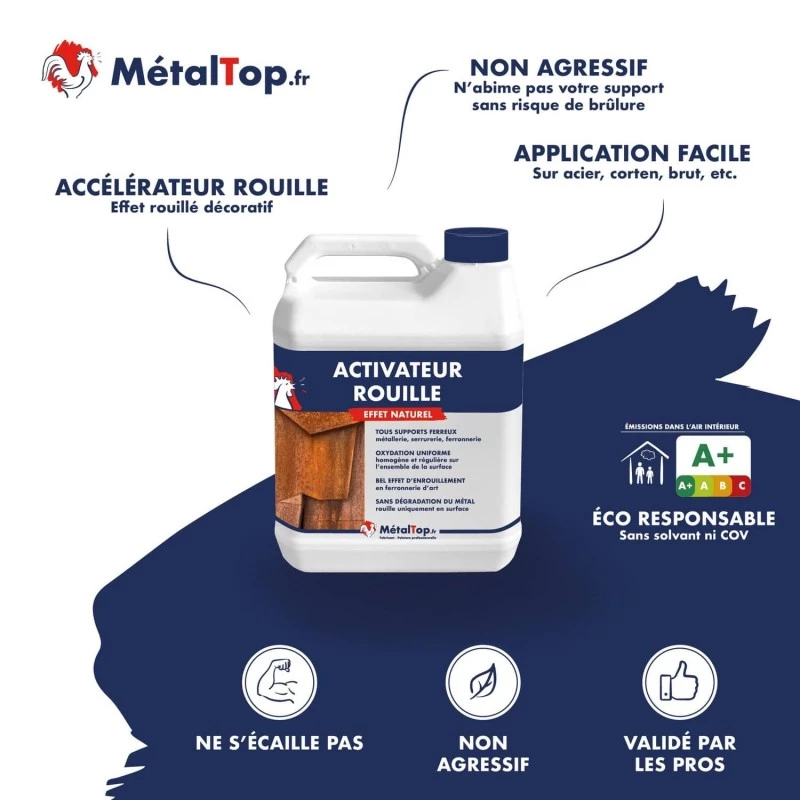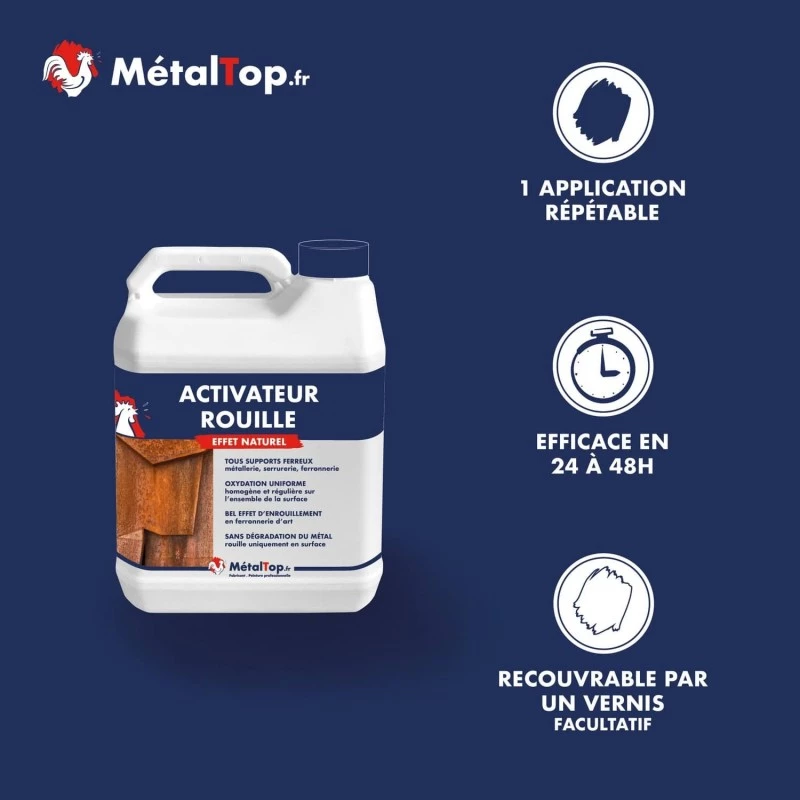 L'activateur de rouille accélère le phénomène d'oxydation sur le métal afin d'obtenir le bel effet d'enrouillement recherché. Il donne une oxydation uniforme, homogène et régulière et non agressive sur l'ensemble de la surface métallique. Il est facilement recouvrable par un vernis métal afin de fixer la rouille et d'éviter toute coulure de rouille subissant les pluies. En intérieur, il est inutile de stopper et stabiliser la rouille à l'aide d'un vernis.