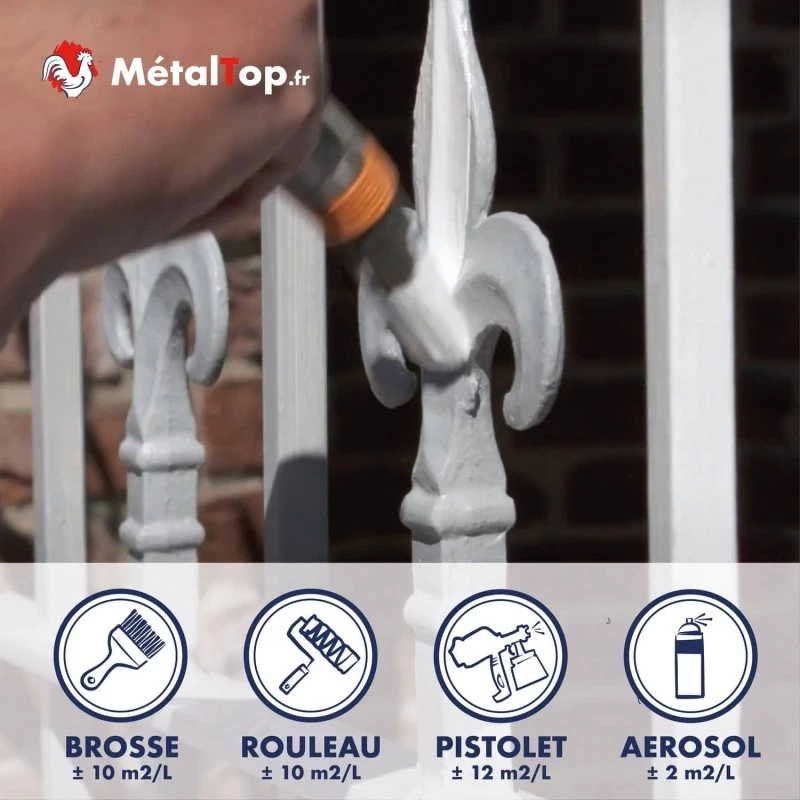 Cet apprêt anticorrosion est plus particulièrement formulé pour adhérer sur les métaux ferreux courants du marché tels le fer, la fonte ou l'acier à l'intérieur comme l'extérieur. Il protège les portails, les clôtures, les garde corps, les volets, les radiateurs, les ferronneries, les mobiliers de jardin ou les matériels agricoles. La peinture de finition peut s'appliquer dans la journée grâce à un séchage très rapide.